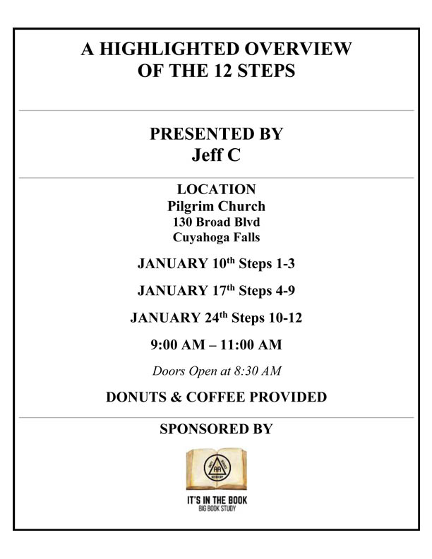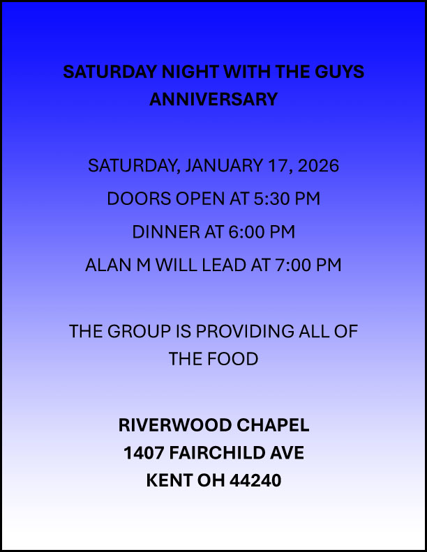 The January Executive Board meeting will be held Friday, January 2 at 7:00 pm at the Intergroup Office, 2212 Romig Rd., Akron OH 44320. The January Council Meeting will be held Sunday, January 4 at noon at the Paridise Club, 1710 Front St., Cuyahoga Falls OH 44221.