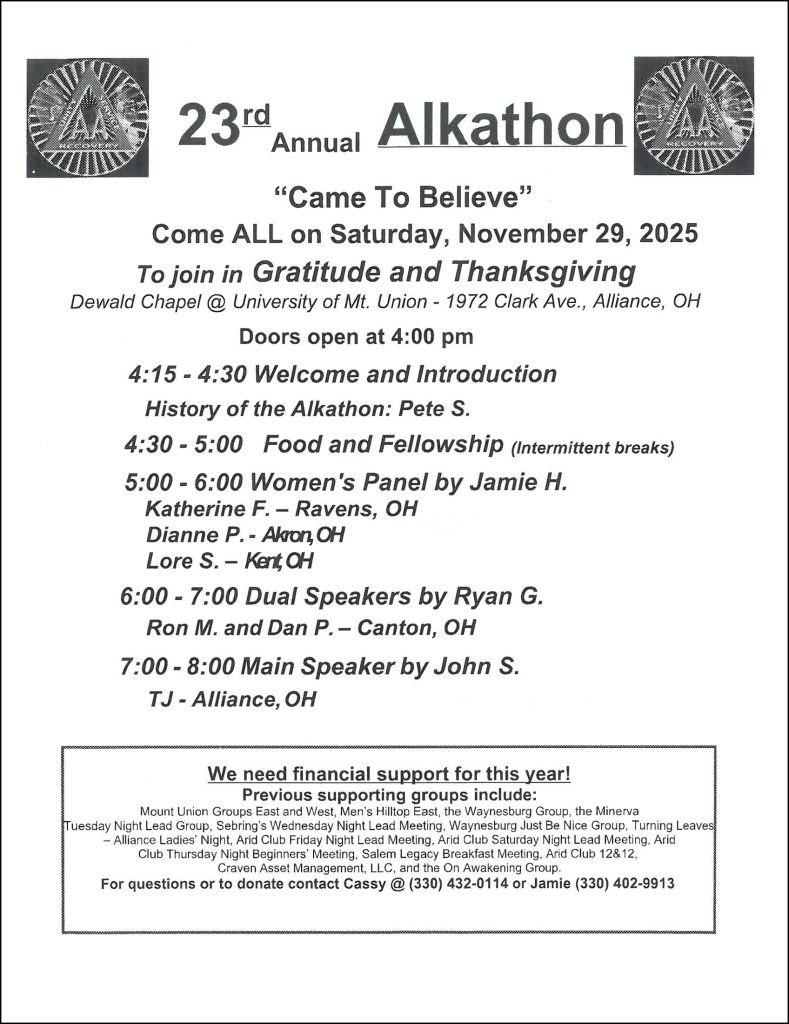Items in the Akron Area AA Archives are no longer on display while we are packing up and preparing for our pending move. We plan to be in our new location on Romig Road by the end of December. Thank you for your understanding.