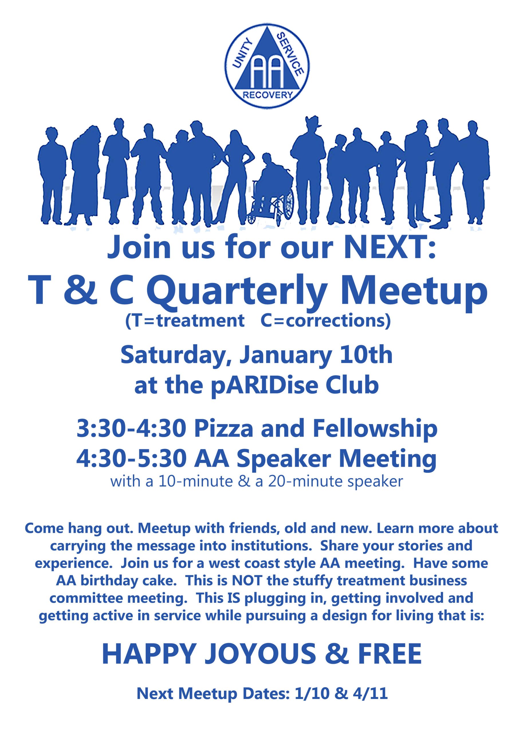 The January Executive Board meeting will be held Friday, January 2 at 7:00 pm at the Intergroup Office, 2212 Romig Rd., Akron OH 44320. The January Council Meeting will be held Sunday, January 4 at noon at the Paridise Club, 1710 Front St., Cuyahoga Falls OH 44221.