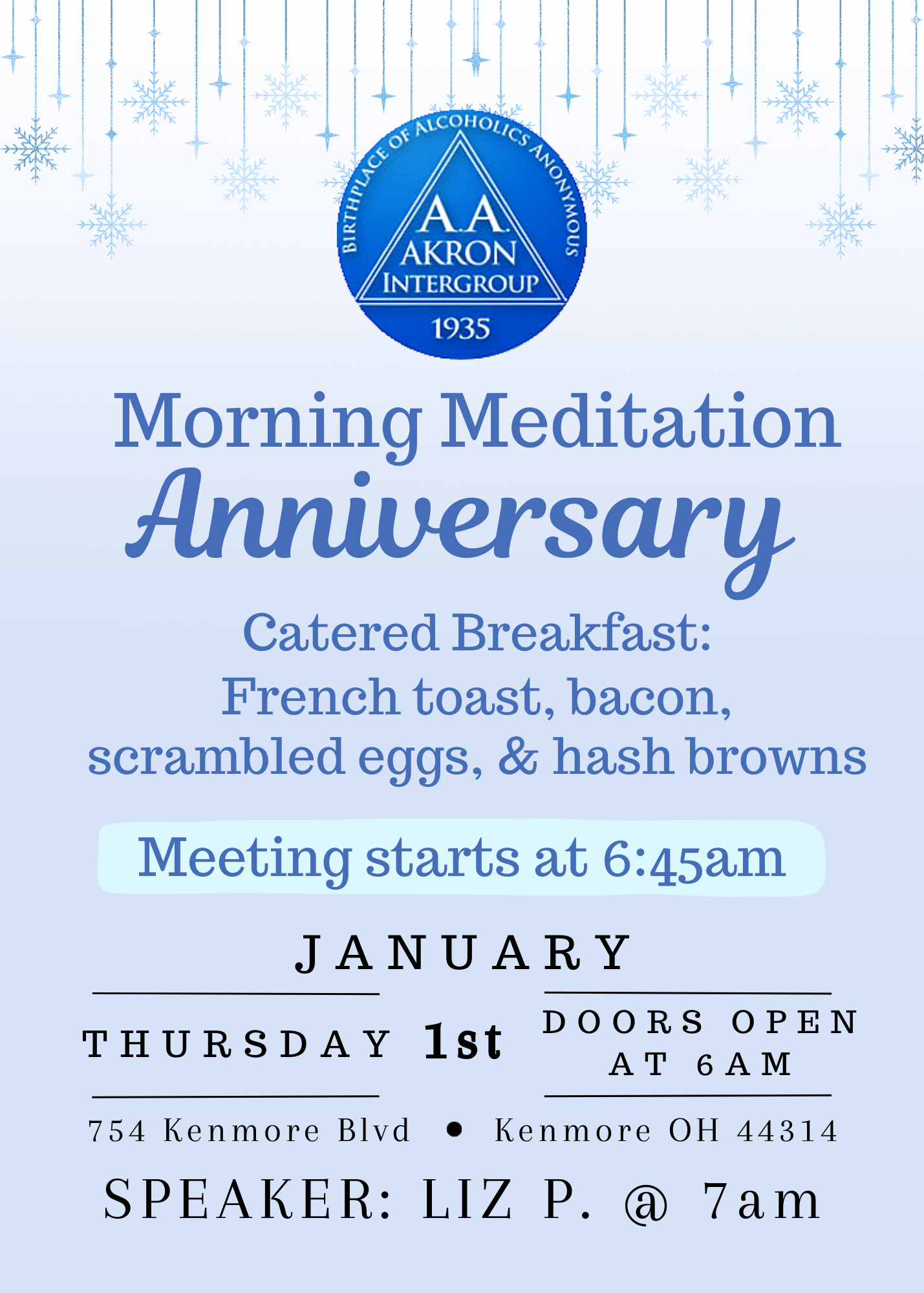 The Akron Area Intergroup Office will be close Wednesday, Dec. 31 at noon and all day Thursday, Jan. 1 for the New Year’s holiday. We will reopen Friday, Jan. 2 at 9:00 am.