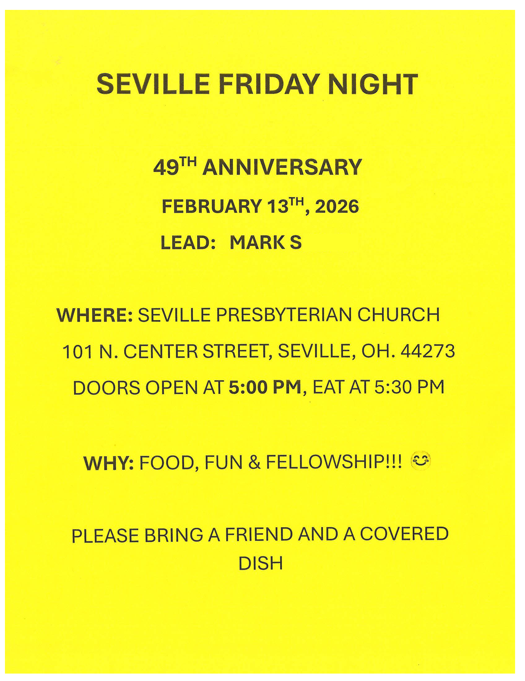 The auditions for this year’s Founders’ Day Play have been moved to Sunday, February 1 from 2-4:30 pm at North Springfield Presbyterian Church, 671 Canton Rd., Akron 44312.