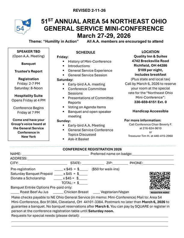 The March Executive Board meeting will be held Thursday, February 26 at 7:00 pm at the Intergroup Office, 2212 Romig Rd., Akron 44320. The March Council meeting will be held Sunday, March 1 at noon at the Paridise Club, 1710 Front St., Cuyahoga Falls 44320.