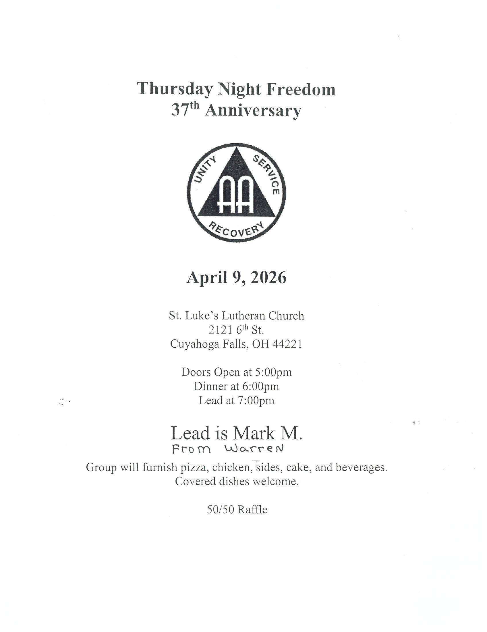 Tickets for this year’s Akron Area Intergroup Anniversary are now on sale online and at the Intergroup Office. The anniversary will be held Sunday, April 26 at Guy’s Party Center. For more information click here!