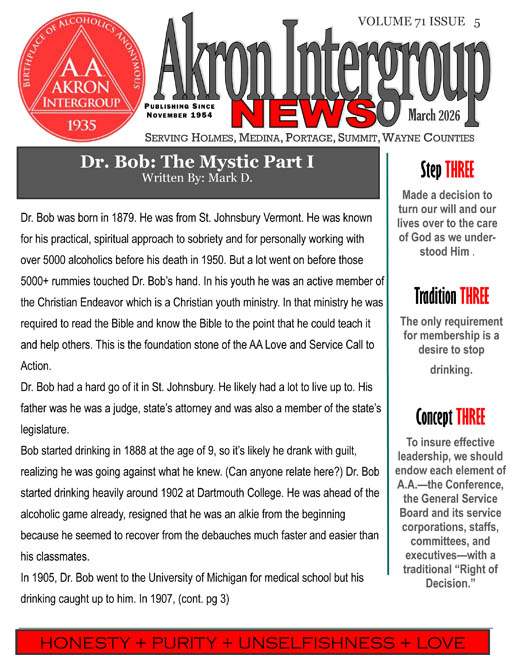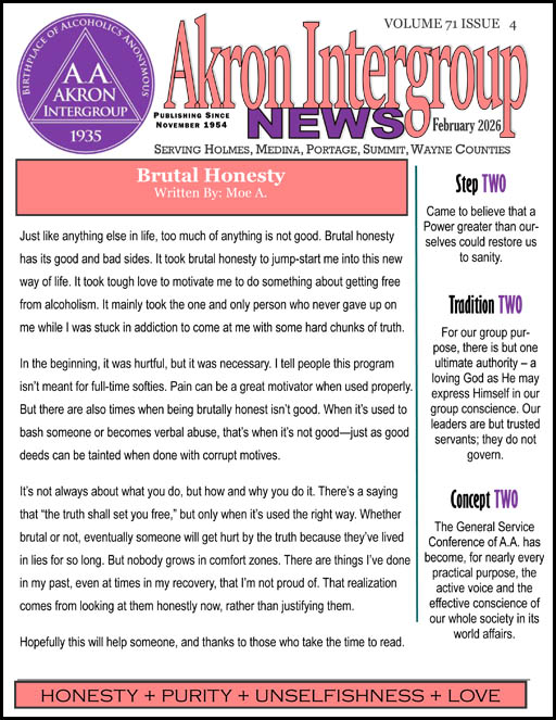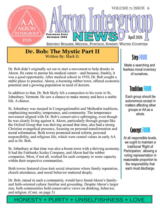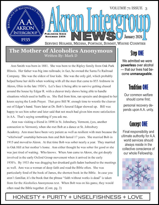 We are the Akron InterGroup News, a newsletter published by the Akron Area Intergroup Council of Alcoholics Anonymous. We carry the message of AA using The Twelve Steps and The Twelve Traditions of AA. The Akron InterGroup News is written by and for members of Alcoholics Anonymous. Our newsletter is published monthly and mailed and/or emailed to subscribers throughout the world! Most of the content is about AA in Akron, Ohio (the birthplace of Alcoholics Anonymous), but we do publish articles from AA groups and members from everywhere.
