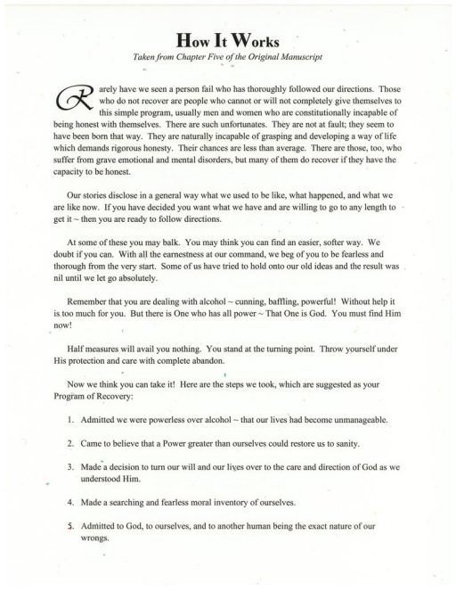 A laminated version of How It Works as it originally appeared in the manuscript of the Big Book, suitable for reading at a meeting.