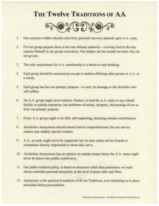 A laminated version of The Twelve Traditions of AA from Chapter 5 of the Big Book, suitable for reading at a meeting.