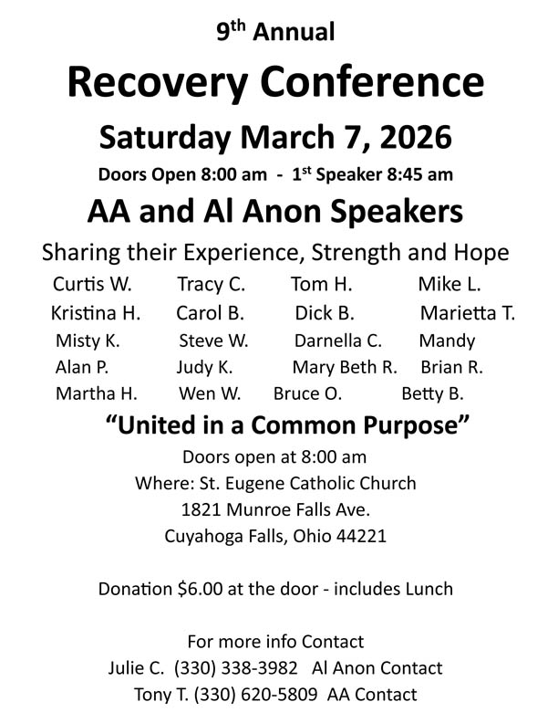 The March Executive Board meeting will be held Thursday, February 26 at 7:00 pm at the Intergroup Office, 2212 Romig Rd., Akron 44320. The March Council meeting will be held Sunday, March 1 at noon at the Paridise Club, 1710 Front St., Cuyahoga Falls 44320.